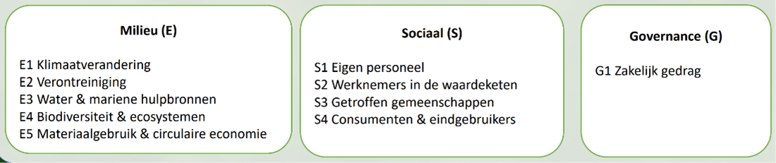 De CSRD is gericht op ESG: Milieu (Environment), Sociale aspecten (Social) en Zakelijk gedrag (Governance). Daaronder vallen 10 thema’s die weer zijn onderverdeeld in subthema’s.