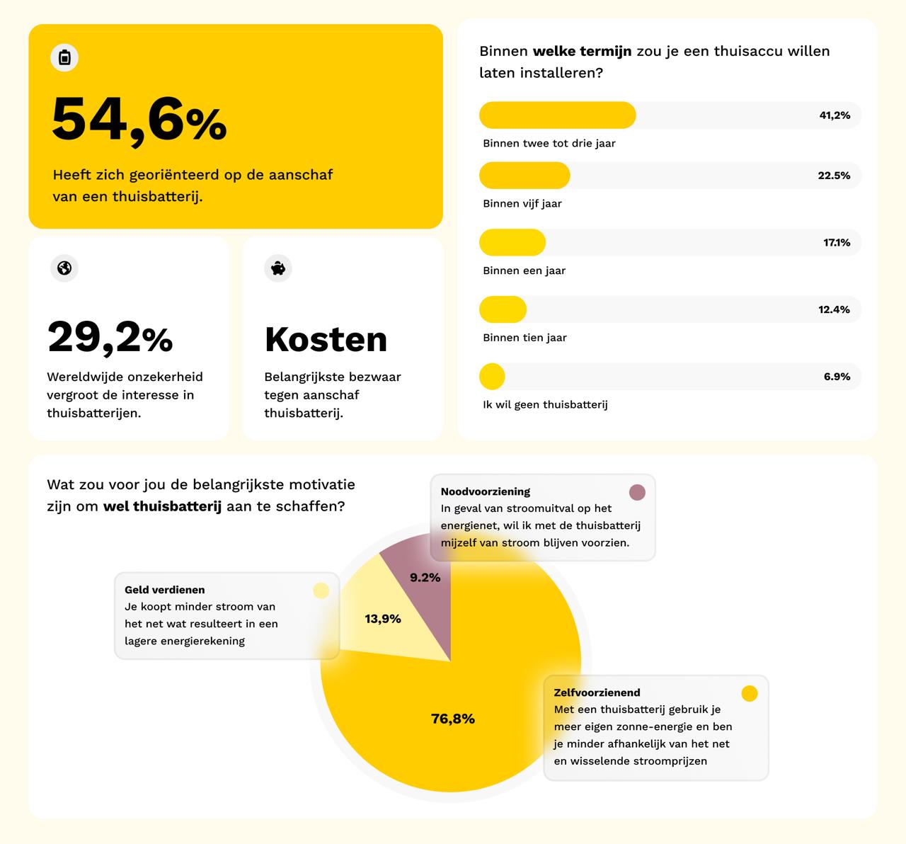 De recente geopolitieke spanningen en oproepen tot crisisvoorbereiding hebben invloed op de energiekeuzes van Nederlandse huishoudens. Uit een onderzoek onder 1.278 eigenaren van zonnepanelen blijkt dat bijna 1 op de 3 van de respondenten door de recente berichtgeving meer interesse heeft gekregen in een thuisbatterij. Uit het onderzoek blijkt ook dat 54,6% van de respondenten zich al heeft georiënteerd op de aanschaf van een thuisbatterij, terwijl 45,4% hier nog niet mee bezig is. Van de ondervraagden die een thuisbatterij overwegen, noemt 76,8% zelfvoorzienendheid als de belangrijkste motivatie, gevolgd door 13,7% die het financiële voordeel ziet en 9,5% die een thuisbatterij als noodvoorziening wil gebruiken.